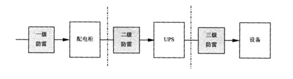 1、机房防雷 机房电源系统的防雷须满足《建筑防雷设计规范》。根据机房大小及设备保护的重要程度,采用一级、二级或三级防雷,设备末端需要有防浪涌插座。根据网络中心机房的实际情况,采用三级防雷方式(如下图所示),即在动力机房电源线进入UPS配电室前安装一级防雷模块,UPS进线前布置二级防雷模块,设备接线插排为防浪涌的三级防雷插排。